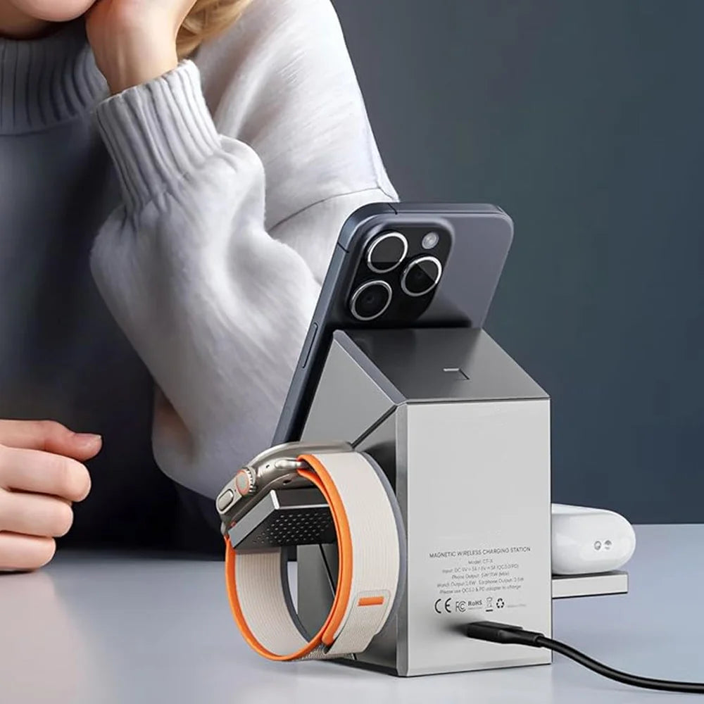 Station de Charge 3-en-1 MagSafe avec Support Rotatif 360° Sans Fil pour iPhone  16, 15, 14, 13, 12, Apple Watch, changeur d'AirPods